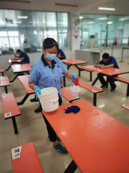 外来人员测量体温、登记、看绿码 员工一人一桌就餐 食堂坚持每天餐间消杀 公司对进口物资进行拆箱消杀
